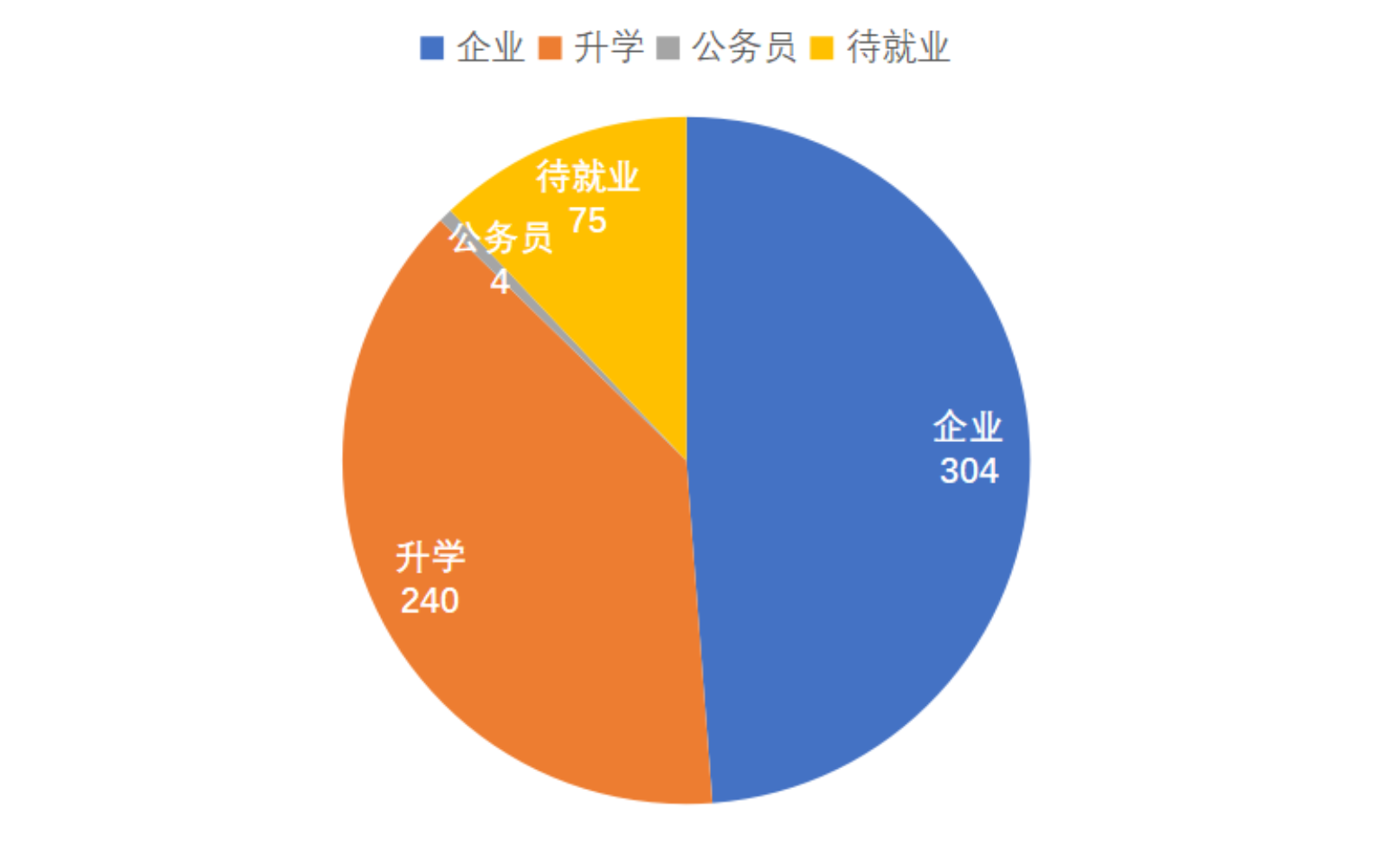 从图10中不难看出就业占毕业生去向的47.83%,考研升学位居其次,占比约为38.52%,选择出国的人数约为1.44%,待就业总人数占12.04%。