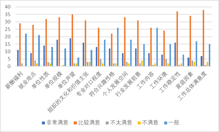 毕业生对目前工作各方面满意度,如图23所示。由图可见,大多数毕业生对就业现状总体比较满意。