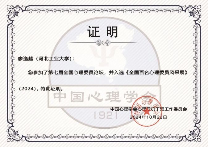 2024年10月,经中国心理学会心理危机干预工作委员会评审,我院廖逸越入选《全国百名心理委员风采展》。