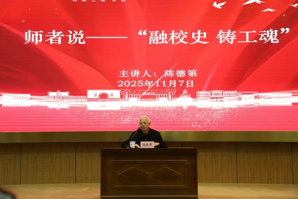 “师者说—融校史  铸工魂”系列活动主题讲座于11月7日9:30,机材楼报告厅举行。学院邀请校原宣传部长、退休教师陈德第担任主讲。陈德第老师将学校122年的办学历程精辟概括为悠久的建校历史、鲜明的办学特色、严格的规章制度、深厚的文化底蕴、骄人的优势亮点、光荣的革命传统六个方面。他如数家珍般地提炼出学校发展史上的“两个最早”、“两个第一”、“两大亮点”、“三个最多”以及“三个辉煌时期”,用详实的数据、生动的语言,为在场师生呈现了一场内容丰富、引人入胜的校史盛宴。陈老师的讲座不仅是一次知识的传授,更是一次精神的洗礼,使在场师生深刻感受到学校厚重的历史积淀与“勤慎公忠”校训精神的传承,进一步增强了“河工人”的历史自信与自豪感。