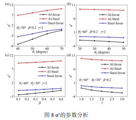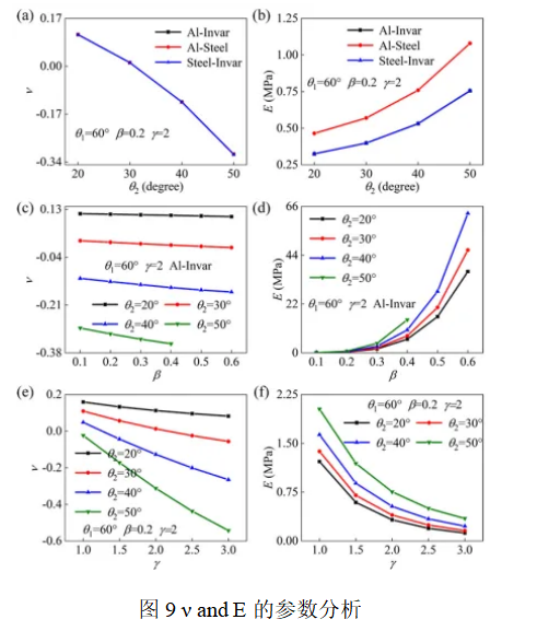 (2) 参数分析表明,通过改变几何参数θ1、θ2、β、γ和材料组合(Al-Invar、Al-Steel和Steel-Invar),3D-BTRH实现了可调控CTE、PR和带隙的多功能集成。特别地,当Al-Steel组合且θ2=40°时,其S(Df)达到最大值10620.7 Hz。当Steel-Invar组合且θ2=40°时,3D-BTRH可以实现NTE和NPR效应,且具有较大的S(Df)。当Steel-Invar组合且θ2=30°时,3D-BTRH可以实现NTE和近零PR效应,且具有较大的S(Df)。当Al-Invar组合且θ2=30°时,3D-BTRH也能实现NTE和近零PR效应。