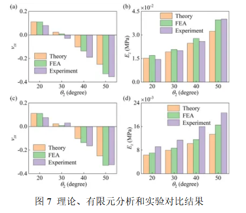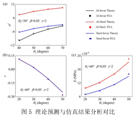 如图5所示,考虑不同材料组合和几何参数下,将等效热膨胀系数和等效泊松比的理论结果与有限元结果进行对比,结果发现有限元仿真结果与理论预测的结果具有较高的拟合度。