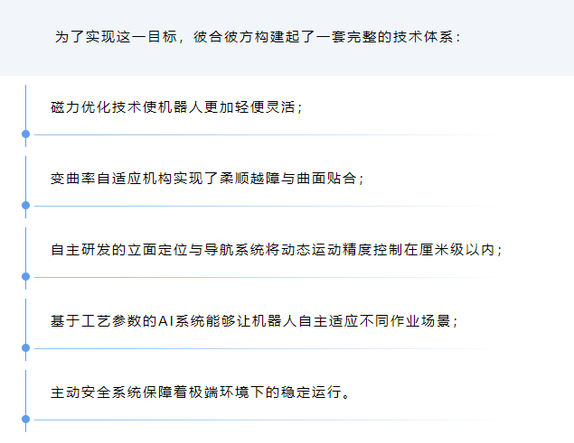 凭借这些行业领先的核心技术,彼合彼方的爬壁机器人产品已在中石油、中石化、中海油、中船、中远、中核、中广核、中电建等众多头部企业实现工程应用,得到了市场的高度认可。