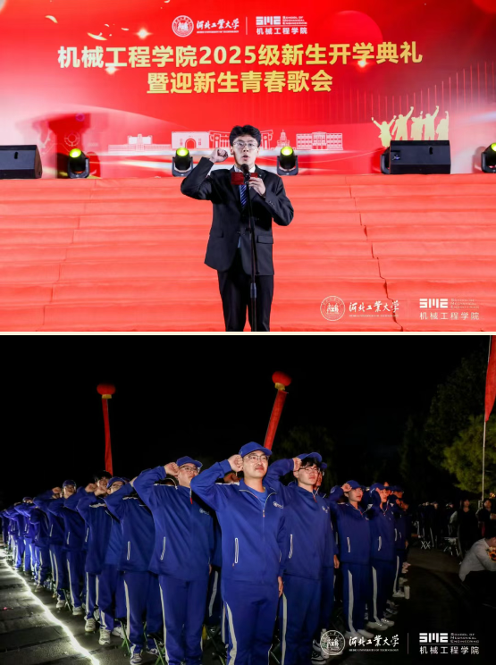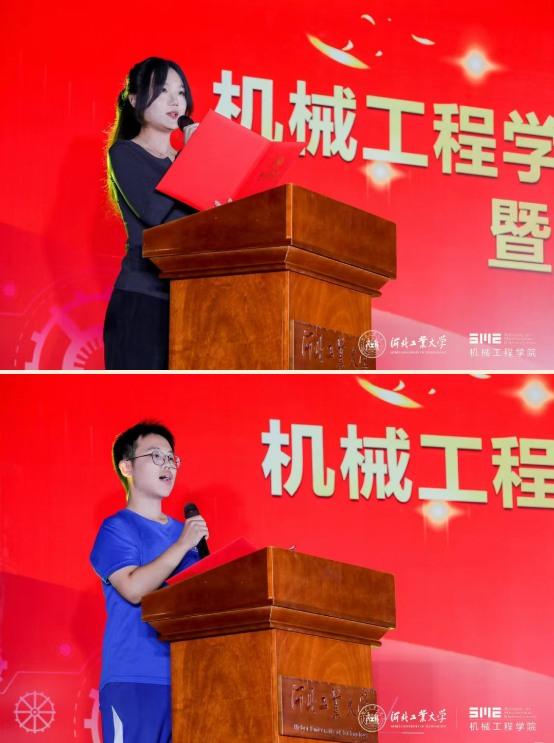 研究生新生代表机研259班张与同同学和本科生新生代表智造251班谷思源同学先后发言。他们表达了对大学生活的期待与向往,承诺将以饱满的热情投入到学习与科研中,以笔为刃,以书为甲,在无涯学海中积蓄力量,彰显青年风采。