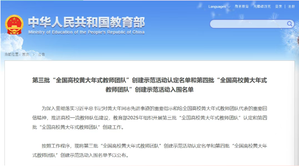 为深入贯彻落实习近平总书记对黄大年同志先进事迹的重要指示和给全国高校黄大年式教师团队代表的重要回信精神,推进高校一流教师队伍建设,教育部组织开展第三批“全国高校黄大年式教师团队”认定和第四批“全国高校黄大年式教师团队”创建工作,于9月5日公布入围名单。