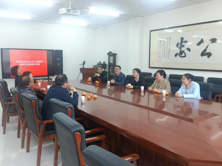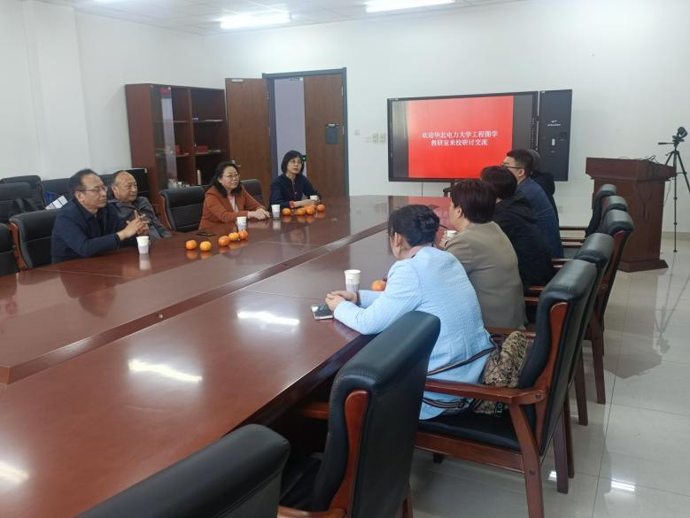 4月15日,华北电力大学保定校区工程图学教研室主任朱晓光、河北省工程图学会常务理事田凤奇等一行四人来我院工程图学教研室考察研讨。机设系副主任商鹏副教授、图学课程负责人刘宇红教授主持座谈会,校督导张顺心教授、青年教师田颖等参与研讨。