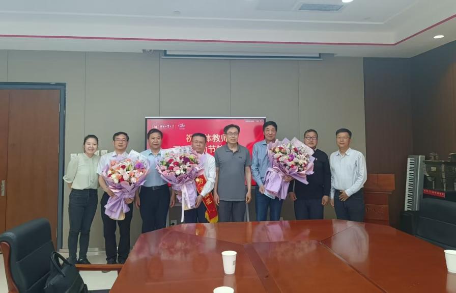 会后,贺立军向三位优秀教师送上鲜花并合影留念。